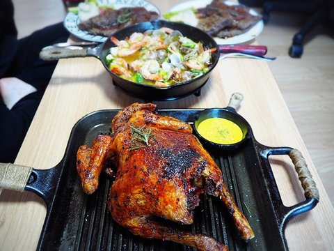 맥주에 담궈서 삶다시피 굽다가 마지막에 겉을 태우기위해 철판을 올려서 뒤적뒤적, 소스바르로 또 한번 뒤적뒤적해줬습니다.
