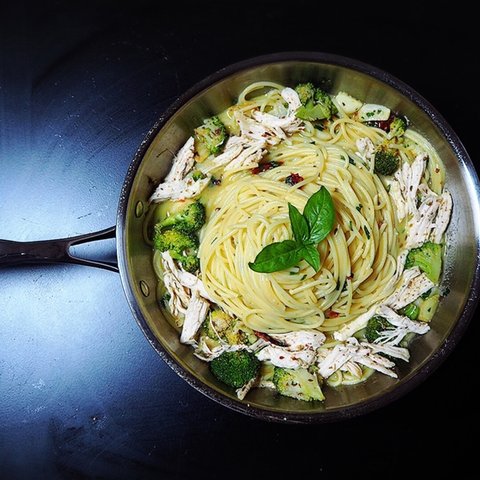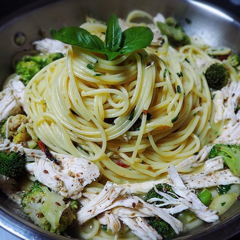 오일파스타에 직접기른 루꼴라와 바질을 뜯어넣고 탄수화물, 지방을 먹는다는 죄책감을 희석시키기 위해 닭가슴살을 찢어넣는 의미없는 짓이 돋보이는 요리, 금방 딴 바질과 루꼴라는 향이 매우 좋습니다.