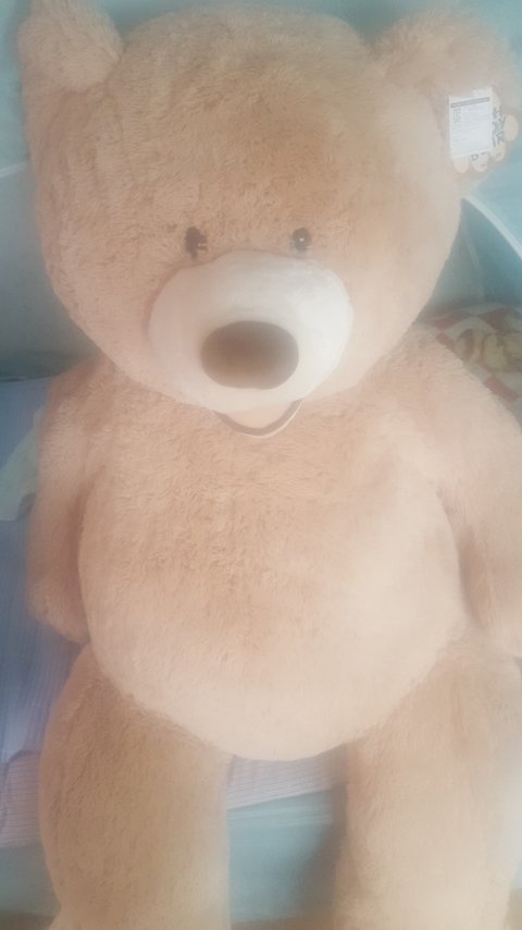문제의 곰인형입니다. 여자친구와 결혼할사이이고 여자친구 생일에 곰인형을 한번도 선물한적없었습니다. 우연히 마트에서 곰인형을 하나 구입했고 여자친구와 저녁데이트하며 선물하려고했습니다. 갈비집에서 먼저 자리잡고 기다리라는 여자친구때문에 곰인형 엎고가느라 창피했습니다. 갈비집손님들도 저를 처다보면서 웃더군요