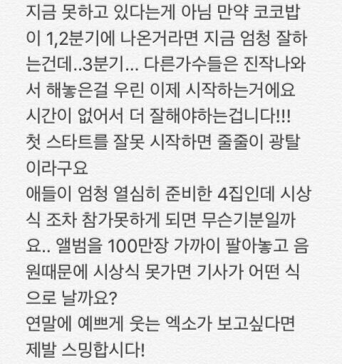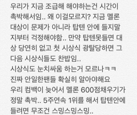 많이 지친거 알고 거의 한 달 차에 10위권안에 드는거면 엄청 잘한거 맞는데 우리 더 잘할수 있잖냐 우리도 음원강자야 애들 웃는거 보고싶잖아 어제 앰넷에서 그렇게 좋아하는거 보면 다 똑같은 마음일거 아냐 열심히해보자 우리 이번년도 지나면 다음년도는 훨씬 수월할거야 이년들아 힘내고 화이팅