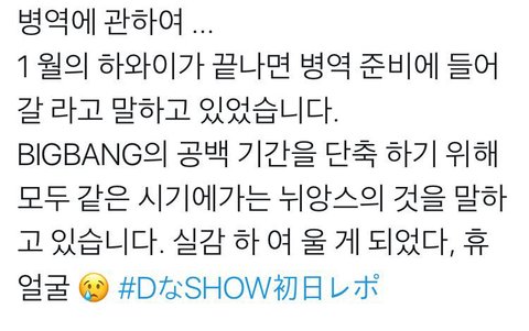 저게 동반입대라는거아냐ㅋㅋㅋㅋㅋㅋㅋㅋㅋㅋㅋㅋㅋㅋㅋㅋㅋ ㅅㅂ 혐석이 올초부터 솔로 첫주자 승리라고 입털더니 입대?ㅋㅋㅋㅋㅋㅋㅋㅋㅋㅋ 막라 솔로앨범은 내주고가야지 미친놈아ㅠ ㅜㅜ ㅠㅠㅠ ㅅㅂ 나머지멤버는 콘서트라도 하고가지 막내 어떡해 진짜ㅋㅋㅋㅋㅋㅋㅋㅋ 이건 사람으로써 너무한거아니야? 나머지 멤버들도 콘서트만 돌리다가 가네ㅎㅋㅎㅋㅎㅋㅎㅋ 제발 와이지 망해라 제발