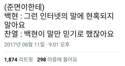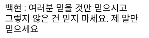 백현이도 그렇고 찬열이도 저런 말을 하겠냐ㅋㅋㅋㅋㅋㅋ 시바 슴도 아닌 백현피셜로 자기 말만 믿으라했으니 믿어야지 뭐