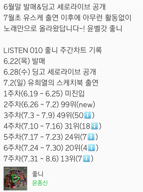 윤jong신님 노래도 순위 낮았었는데 딩go,너스케 효과를많이봤음 그래서지금 9위 물론노래가 좋기도하지만