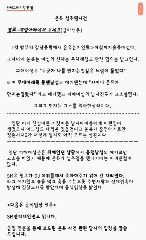 보니까 지인 축하때문에 클럽가서 술먹고 놀다가 여자랑 부딛혔거나 실수로 닿았는데 (여자가 만졌나?하는정도라들음) 그 여자 남친?남사친이 샤이니 온유가 너 만졌어 해서(이것도 어이없는듯 남친있는친구or여친이 만져지고있는걸 보고서 바로 제지하는게 아니라 걍 가만히 있었단거ㅋㅋ) 고소ㅋㅋㅋㅋ