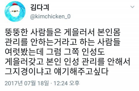뚱뚱한 사람이 게으른건 맞는데.. 살빼는게 그만큼 힘들고 대단한 거잖슴? 근데 살을 안뺀다고 그게 욕먹을 짓인가? 일부사람들 뚱뚱한거 혐오하는거 알겠는데 당사자가 자기 본인 삶에 만족하고 딱히 필요성을 느끼지 못하는데 거기다가 손가락질하고 틀렸네 뭐네 할 자격은 누구도 없지않음 ?