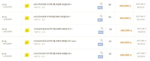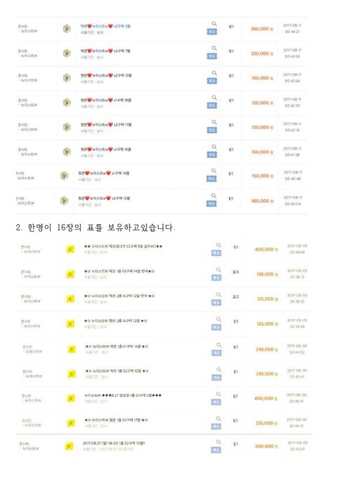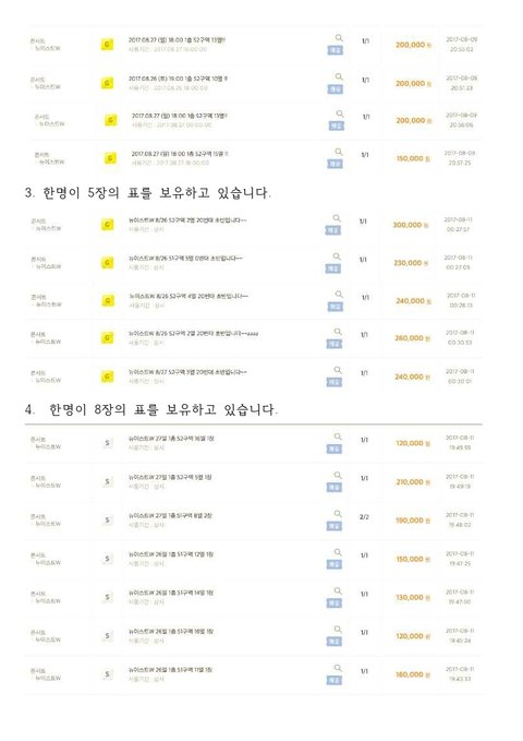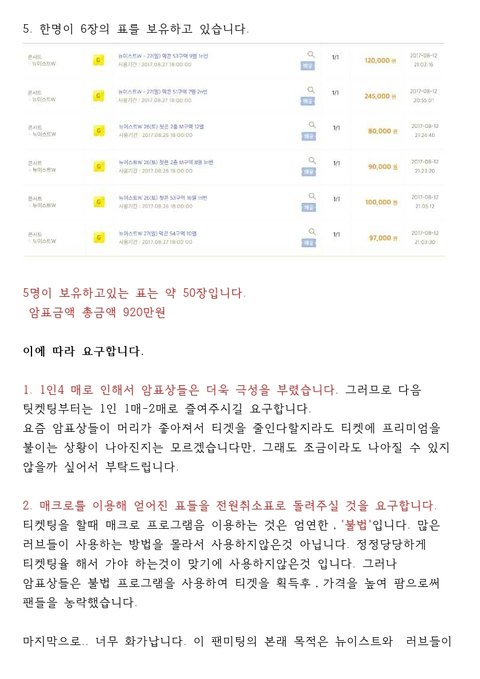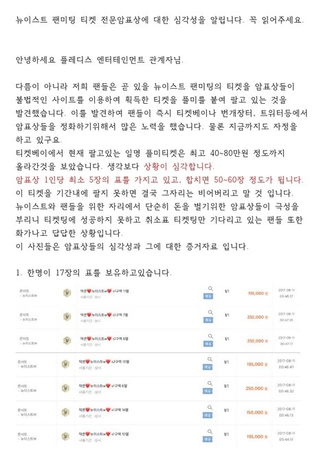 다름이 아니라 저희 팬들은 곧 있을 뉴이스트 팬미팅의 티켓을 암표상들이 불법적인 사이트를 이용하여 획득한 티켓을 플미를 붙여 팔고 있는 것을 발견했습니다. 이를 발견하여 팬들이 즉시 티켓베이나 번개장터, 트위터등에서 암표상들을 정화하기위해서 많은 노력을 했습니다. 물론 지금까지도 자정을 하고 있구요.