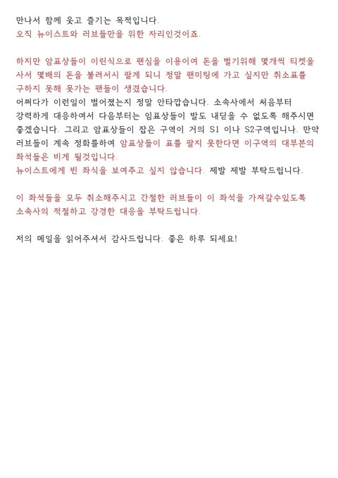 이 좌석들을 모두 취소해주시고 간절한 러브들이 이 좌석을 가져갈수있도록 소속사의 적절하고 강경한 대응을 부탁드립니다.