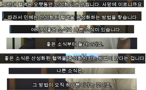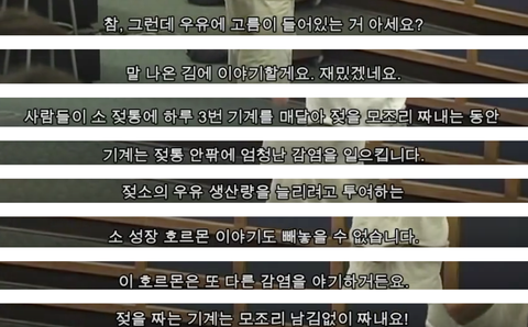 그리고 그런 고통에서 몸부림 치는 소의 스트레스 호르몬, 쉽게 번식하는 병균 세포들, 투여된 엄청난 양의 항생제, 스테로이드제, 최대한 많은 젖을 얻기 위해서 기계로 짜내면서 같이 나오는 고름은 어쩔 수 없이 소의 분비물인 우유에 고스란히 담겨.