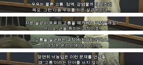 낙농업에선 그 우유를 멸균하는데 멸균은 세균을 없애는거지 고름이나 다른 나쁜 세포까지 걸러내줄 순 없어.