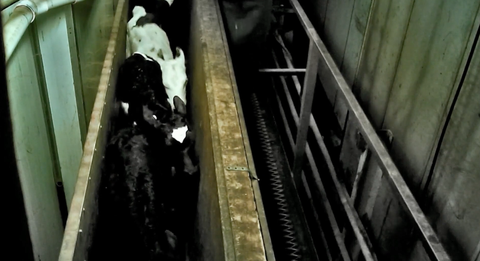 인간들에서부터 우유의 엄청난 수요을 맞추기 위해서 강간 막대 rape rack 가 암컷소에 들어간 모습.