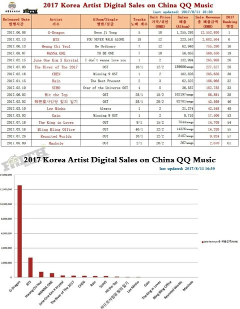 ■ 한국가수 매출 순위1위 지드래곤 (종합 1위)2위 방탄소년단 (종합 6위)3위 황치열4위 워너원■ 참고로 지드래곤은 중국가수 합해서 전체 종합 1위( 맨 오른쪽 랭킹 = 종합 랭킹 )