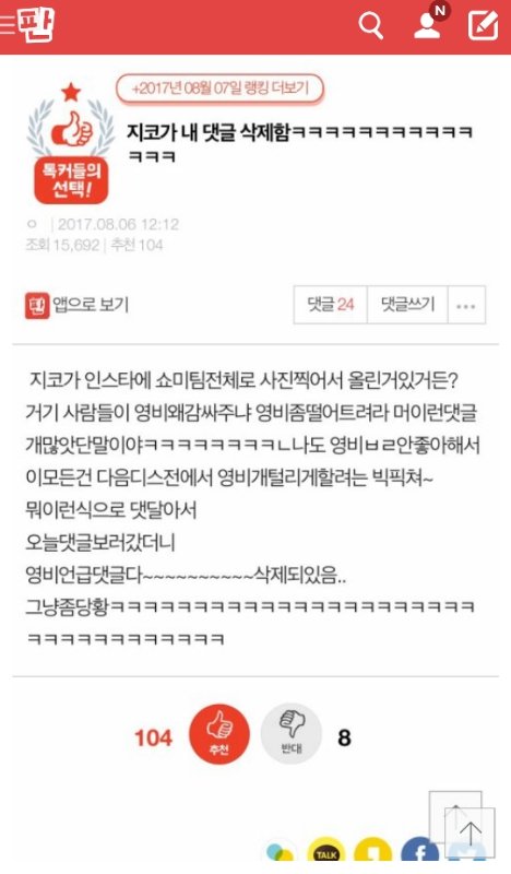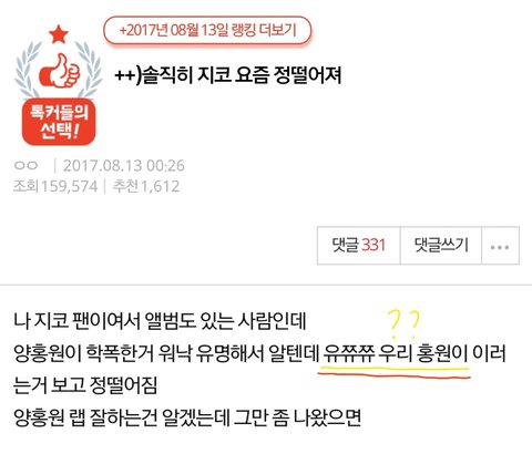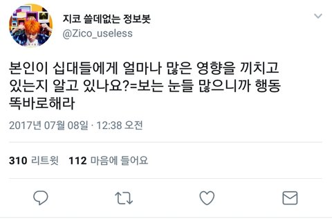 이거는 진짜로... 거기는 가해자 영비놈 인스타가 아니잖아ㅋㅋㅋㅋ 지코 인스타인데 댓글 관리는 지코 자유지~ 양홍원이 불편해할까봐 그랬을 수도 있지만, 무엇보다 양홍원 계속 까는 댓글을 지코가 자기 인스타에서 왜 봐야돼. 댓글 관리는 지코 몫이고 너네가 뭐라고 할 자격 없어. 지코가 그 댓글이 불편하면 삭제해도 되는 거야. 근데 지코가 불편해 하는 이유를 너넨 모를 거 아니야 ㅋㅋㅋㅋ 너네라도 페북에 같은 조 애들 태그해서 올렸는데 어떤 애 욕만 있다고 생각해 봐 ㅇㅇ 니가 불편하기도 조카 불편할거도 걔도 불편할 수 있어서 배려해준 거 아닐까 싶다 이것도 지코 아니면 모르는 건데 왜 몰아가ㅠㅠ