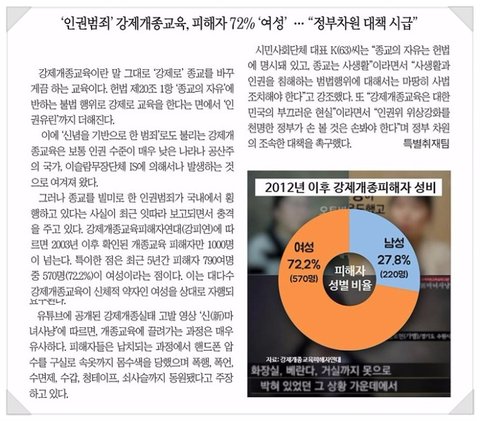 더구나 개종하는 과정에서 본인의 의사는 철저히 무시된 채 납치, 감금, 폭력을 행사하니대한민국은 종교자유국이건만, 버젓이 불법이 자행되는데도,피해자들이 법의 보호를 받지 못하는 슬픈 현실입니다.