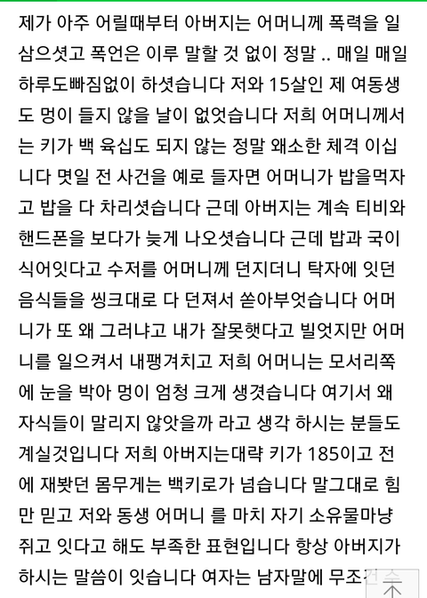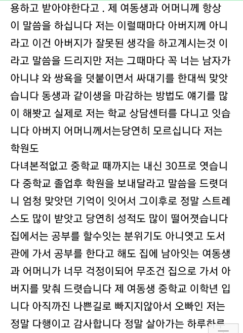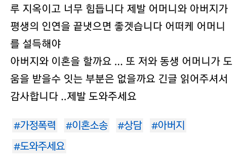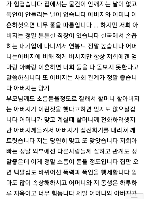 저는 열일곱 입니다 동생은 열다섯 중 2이고요 어머니와 아버지는 40대 이십니다 네이버에 방금 올린 글입니다 비록 캡처해서 가져온 글 이지만 읽어 주셧으면 좋겟습니다 도와주세요 .. 저기에 쓴 글 이외에도 저와 동생 어머니는 심각한정도의 스트레스를 받고 눈물 흘리며 밤을지새웁니다 죽고싶어요 정말 위로의 댓글감사하게 받겟습니다 어떻게하면 좋을까요 정말