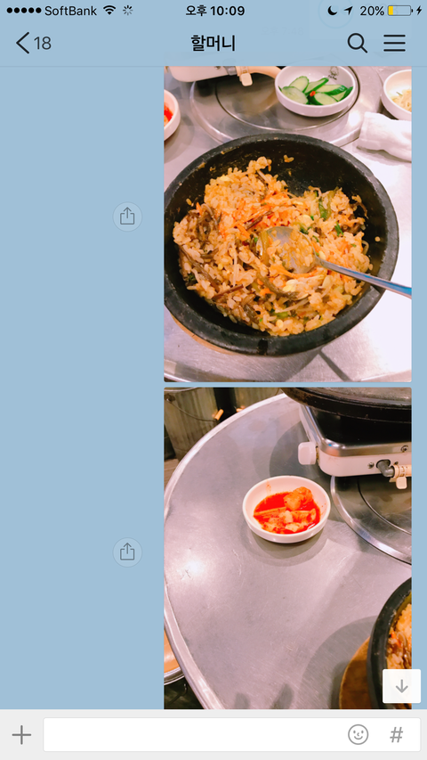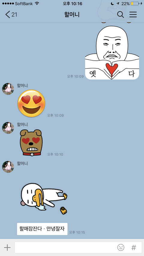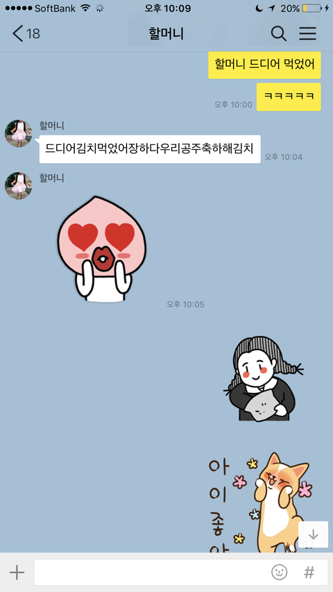 도쿄에 친구가 있어서 친구랑도 놀고 나 혼자서 여기저기 다니는데 김치가 너무 먹고싶은거야ㅠㅠㅠㅠ 김치가 너무 그리워서 온지 11일만에 시부야가서 김치를 먹었어ㅋㅋㅋㅋㅋ일본에 있는동안 내가 할머니한테 페톡으로 김치가 너무 먹고싶다고 그랬어 그래서 오늘 비빔밥하고 깍두기 인증샷을 보냈는데 답장이 저렇게 옴ㅋㅋㅋ어디서 이모티콘을 배우셨는지 귀여우셔ㅋㅋㅋ