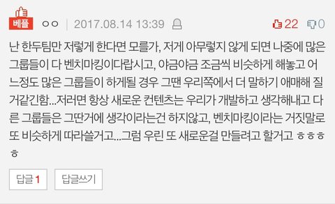 이거 아까 '콘텐츠 모방 관련해서 글쓰는거 어때?' 라고 물어본 이삐한테 댓글 쓴건데 복붙할게. (댓은 삭제했지만 읽고 공감해준 이삐가 있어 남김) 비슷한 글이 배톡에도 있을줄 몰랐어. 우선 대부분의 이삐들과 반대되는 의견일수더 있기에 원한다면 아미인증 해줄게.
