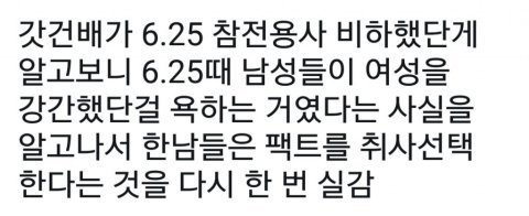 아니 솔직히 메갈이다 일베다 하는데 그딴 거 다 필요없고 다 맞는 말만 하는 거 맞잖아 ㅋㅋㅋ 내가 오버워치 해서 아는데 여성유저 성희롱에 비하발언 엄청 심해 5판중 3판을 당하는 정도로 이런 거 때문에 갓건배가 총대매고 그렇게 일부 남성유저들한테 ((일부)) 말해주는 거 나만 통쾌하냐 ㅋㅋㅋ 아무생각 없었는데 오늘 보고 난 진짜 개사이다네... 싶었는뎅 ㅎㅎㅎ... 그리고 6.25 그것도 그 사이에 강간한 남자들 욕하는 거라며 ㅋㅋㅋ 그런 거 따지면 갓건배가 잘못한 거 하나 없는 것 같은데 난