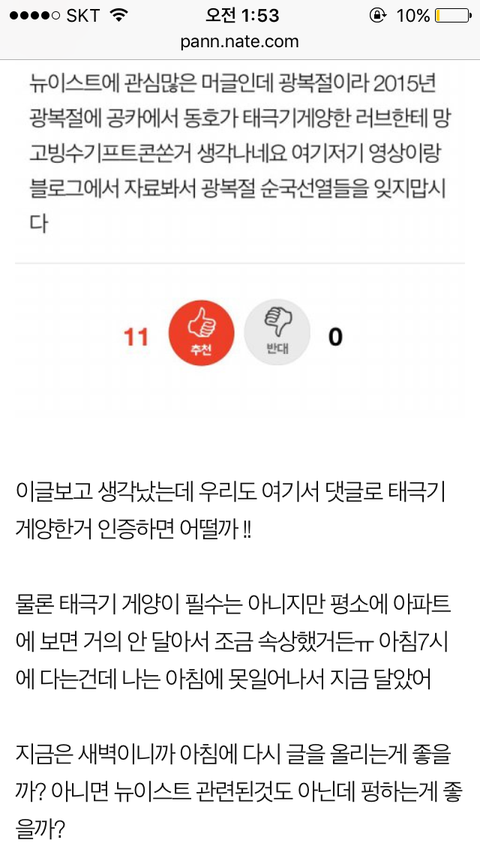 아까 이 글 썼던 쓰닌데 댓글에 스밍인증 앞에 태극기인증 넣는게 어떻나는 의견있어서 다시 글 써!! 다른 러브들 생각은 어때?