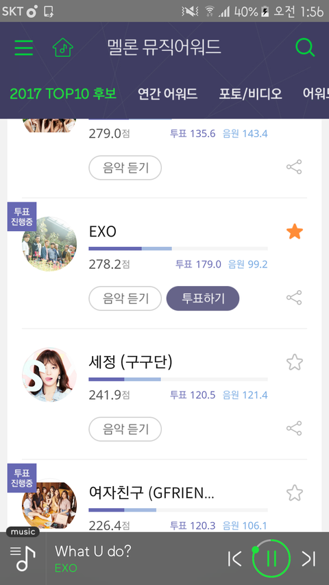지금 우리 컴백주부터 70점 2번 69점 1번에 폴랖해서 278점임 앞으로 322점인데 이번주 아마 퉆은 우리가 이겨도 인기상은 못받을거임 그럼 5번 1위는 바이바이고 600점채우는 방법으로 가면 점수주는건 매번 일정하지않고 비율로 주는거같음 투표1 등해서 30점 받는다치고 주간차트 11위 유지하면 23점 해서 이번주 대강55점치면 이제 267 그다음주도 50 점(주간챁 내려가니까) 하면 217 그담주까지해서 167 그다음주엔 20권챁 아웃할삘