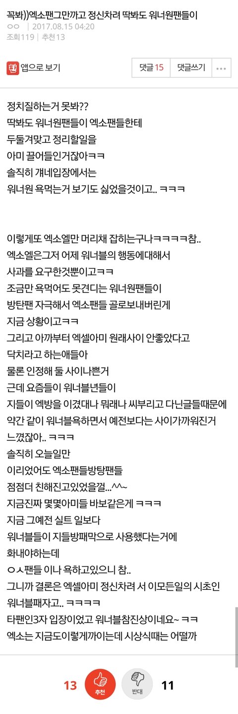 사과 받고싶은 마음 다 이해하는데 따로 실트를 만들던가 왜 굳이 타팬덤 싸움에 끼어들어가서 저난리인거임 지금만봐도 워너블은 쏙빠지고 엑방싸움으로 개싸움됐음 워너블 애들이 손안대고 코풀려는거에 그대로 말려들어갔잖아 ㄹㅇ 멍청한건지 뭔지... 왜 사서 방패막이를 자처하는지 모르겠네