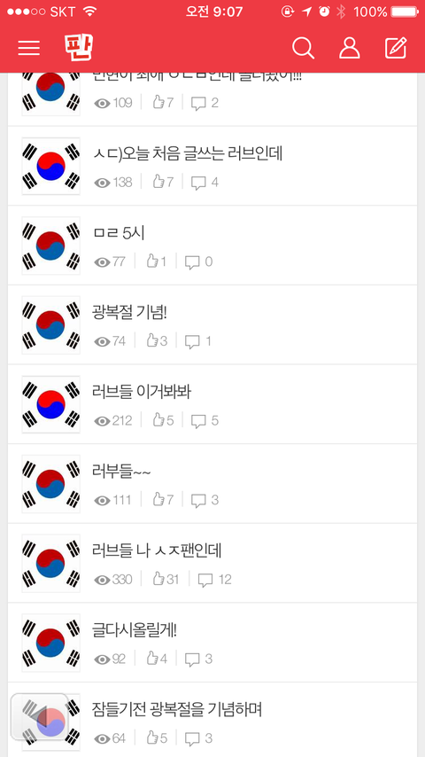 자구 일어나서 습관처럼 톡 들어왓눈데 태극기보고 혼자 감동받아서 소름 돋앗오 우리 러브들 맘이 너무 이쁘다 오늘을 잊지말자~^•^