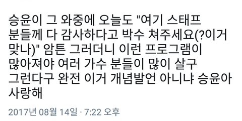 평소 음방때도 좋은 무대 꾸미느라 수고해주신 스탭분들께 감사인사드리라고 항상 말하는 리더와 스탭들께 감사합니다라고 외치는 팬들, 최고야ㅠㅠㅠㅠㅠ