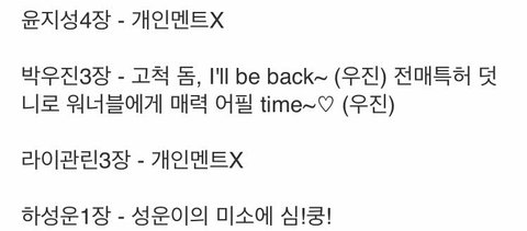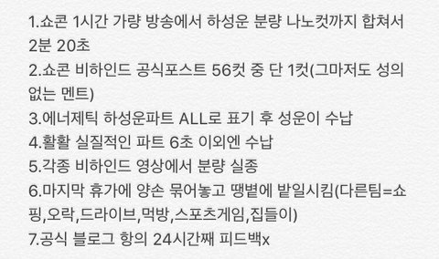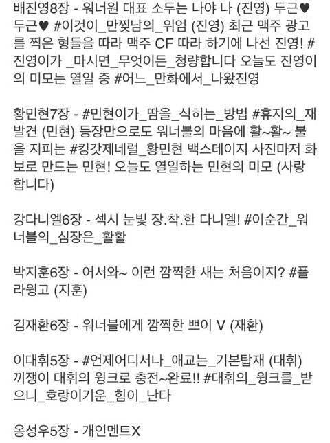 진짜 워너원 공식 블로그에 사진뜬것도 총 56장중에 하성운사진은 개인사진1장밖에없을뿐더러 애들끼리 낑겨있는사진도없어 진짜 단독사진 하나뿐이야 그리고 다른애들 멘트할때는 딱봐도 정성스럽게 다 써놨는데 하성운은 심!쿵! 이게뭐냐고진짜ㅠㅠㅋㅋㅋㅋㅋㅋㅋ 11위로 되었다고 무시하는건가..? 진짜 아니 쇼콘방송해줄때도 인터뷰 짤라먹질말던가 진짜 인터뷰 단 한번도 안나왔다고 누가보면 쇼콘하다가 하성운 집간줄알겠어 24시간이 넘었는데도 피드백안해주고ㅋㅋㅋㅋㅋ