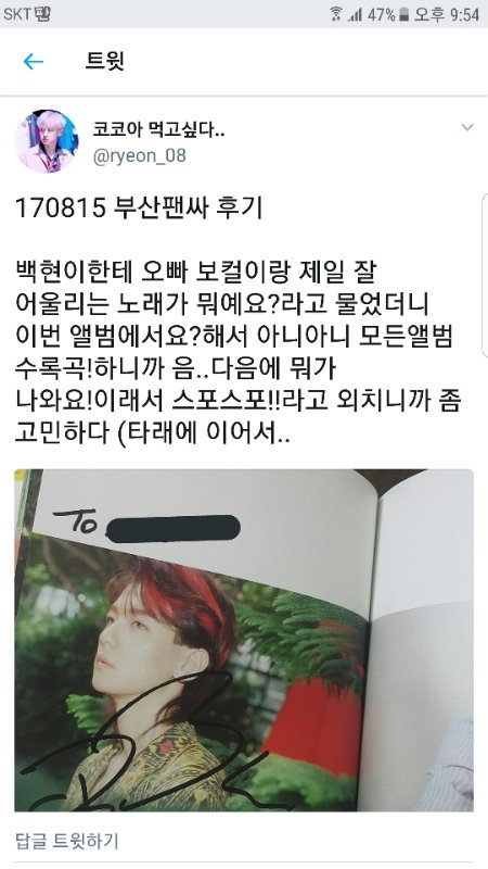170815 부산팬싸 후기 백현이한테 오빠 보컬이랑 제일 잘 어울리는 노래가 뭐예요?라고 물었더니 이번 앨범에서요?해서 아니아니 모든앨범 수록곡!하니까 음..다음에 뭐가 나와요!이래서 스포스포!!라고 외치니까 좀 고민하다 (타래에 이어서..