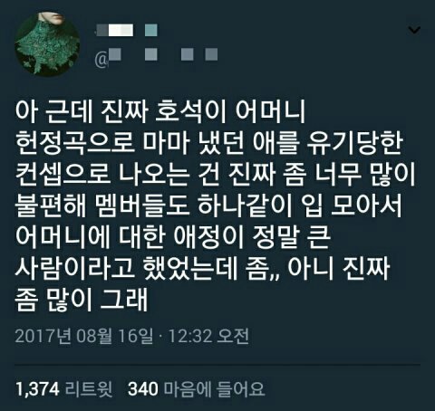 호석콘 윙콘에서 마마 무대하는 거 보고 진짜 감동 받아서 울었던 난 좀 많이 실망함... 팬 중에 실제로 이 경우가 있는 팬들도 있을텐데... 소속사도 무슨 생각이 있겠지만 그래도 좀 많이 그렇다...