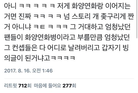 팬들입에서 ㅈ구리다는 소리가 나올 수 있나?ㅋㅋㅋㅋㅋㅋ저정도면 팬그로아니야? 오히려 어그로한테 먹이 던져주는꼴 진짜 짜증난다 이렇게 말할거면 ㄱ냥 ㅡ탈덕했으면 좋겠어