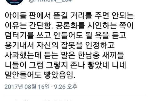 ㅇㅎ소년단 말고 더 있음?? ㅋㅋ 어차피 피드백 보지도 않고 방탄이 그일 이후로 전담선생님까지 있는데 노력하고 배우는건 아예 보지도 않고 옛날일로 지금까지 까면서 여혐으로 후려치는게 쟤네들임ㅋㅋㅋㅋ 실총해서 얻은게 여혐하면 = 방탄이 되어 버렸단말임ㅋㅋㅋㅋ