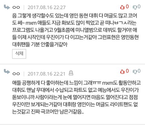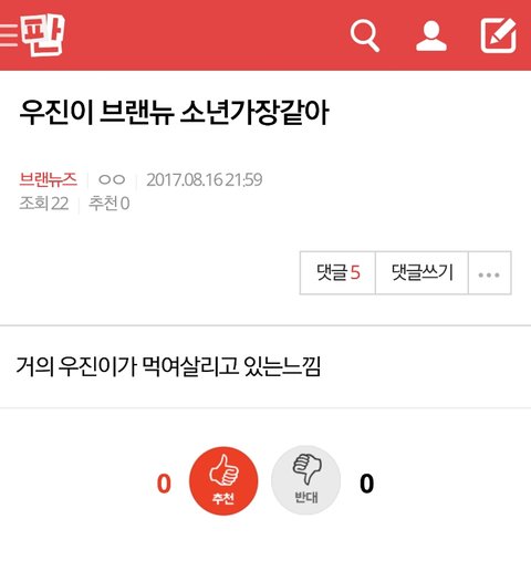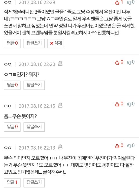 저 글 들어가지말자 그냥 우리 브랜뉴팬들 분열시킬려고 저러는거같아.. 정말 팬이였으면은 삭제했을텐데..