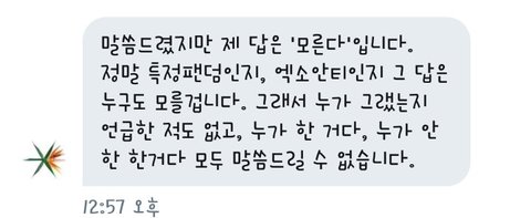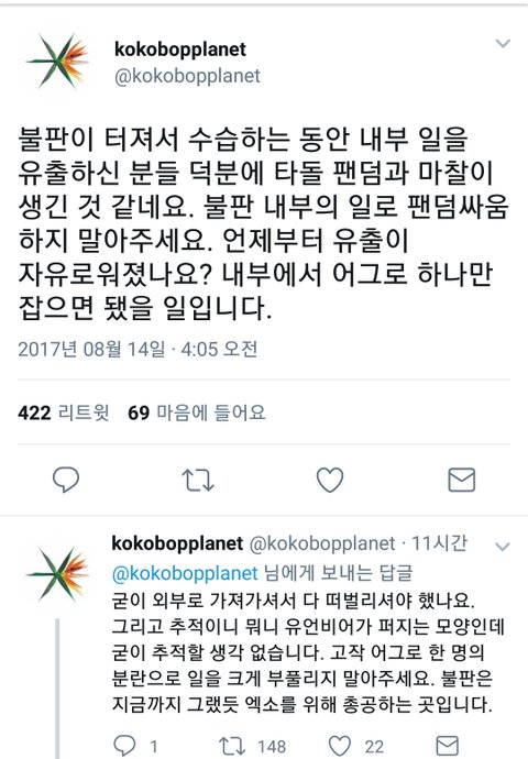 엑소엘들아 너네 자꾸 불판 들어온건 사실이네 어쩌네 하는데 워너원 팬들 중 들어간 사람 있다는 증거 아무도 없고 심지어 니네 총대도 누군지 모른다고함