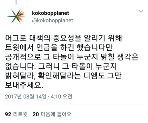 이런식으로 무슨 팬덤 전체를 범죄자마냥 몰고 가놓고 피할 생각 하지마 너네 다수의 팬들이 리트윗 하고 글 올린거 하나하나 다 캡쳐해놨어
