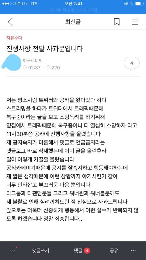 또 이런 글 써놓으면 공카 일이나 옾챗 일 끌고오겠지? 그거 트위터에 사과문만 검색하면 당사자들 올린거 쭉 나옴 여기와서 말하지말고 일단 찾아보고 말해