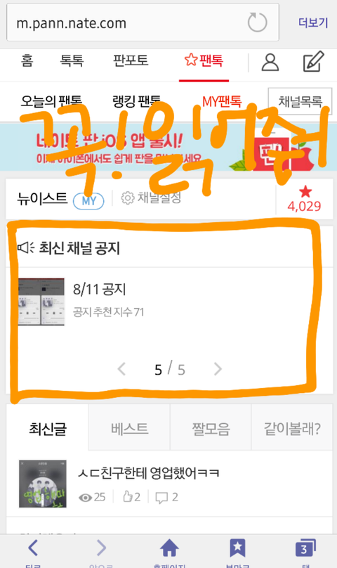 팬톡 위에 공지 보이지..? 5페이지로 넘기는데 시간 10초도 안걸린다..? 저기엔 우리 팬톡 규칙이 있어! 대표적으론 러브들은 글을 쓸때 제일먼저 스밍인증을 해야해.