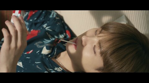 사탕을 물고있는 윤기 담배를 보다 곧 웃으며 던져버림 전화를 기다리는듯 했으나 그냥 눕는데