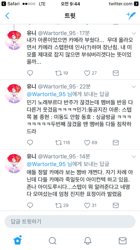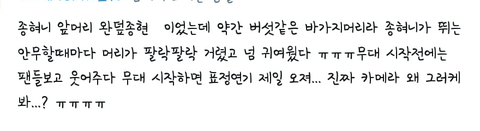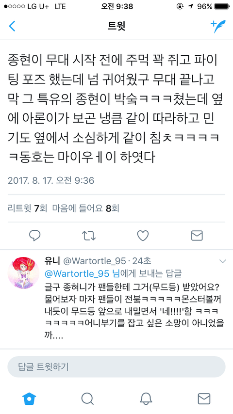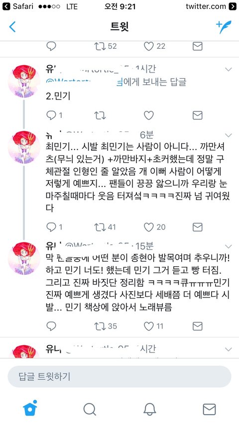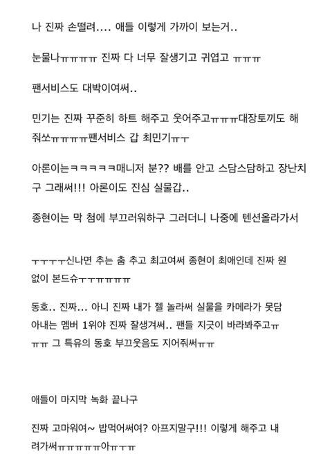 동호에 이어 더 자세히 풀겠슴돠 제정신아니여서 헛소리로 들릴수 있음주의ㅇㅇ 지인짜 민기는 생각보다 더 예쁘장해...나는 미자때 비해서 민기가 가장 많이 바뀌었다고 생각했는데 오히려 얼굴에 미자얼굴많이 남아있음 지인짜 예쁘게 생겼고 보자마자 헉소리나옴...진짜로 화면보는거같았엌ㅋㅋㅋㅋㅋㅋ얼굴을 보고있는데 실감이 안낰ㅋㅋㅋㅋㅋ그리고 팬사랑의 대명사답게 개인멘트에도 반응 엄청해주고 꺅 하몀 쳐다보고 손흔들어주고 그래써...러브들이 막 좀만 해도 소리지르니까 아예 책상에 턱괴서 이쁜짓하고ㅠ난리났음ㅠㅠ 글고 아로니 진짜 귀여웟던게 다른 멤버들도 그렇긴했지만 아로니가 진짜 팬들이 막 소리지르면 ??이렇게돼서 쳐다봄ㅋㅋㅋㅋ짱귀여워ㅋㅋㅋ그 댄서분 손 잡을때마다 소리지르니까 ??이러다가 막 웃고 그랬음 짱귀...글고 밑에서 썼지만 아로니 엄청 귀엽다고 생각했는데 오히려 대어른남신같았음ㅇㅇ 성숙하고 진짜 어른미넘쳐ㅠㅠㅠ대존잘ㅠㅠㅠㅠ글고 종혀니 정말 처연부기ㅇㅇ 종혀니 연기해야겠더라...걍 눈빛이 너무 슬픔...진짜 당황스러울정도로 처음부터 아예 감정도 잡아서 무대 올라가고 계속 처연처연 이런느낌ㅠㅠ그러다 ng나고부터 웃었고 위에 후기처럼 마지막에 잔망떨어줌ㅎㅎㅎ그리고 마지막무대 전에 막 소리지르니까 쁘이! 하고 제자리갔음 졸귀....그리고 내가 느낀게 하면서 점점 익숙해졌지만 처음에 동호가 팬들 들어오는거보고 우와 하면서 쳐다보고 애들도 자기 몸짓하나에 다 반응하니까 이게뮤ㅓ지??이런 반응이였어...진짜 아직 인기 실감 못하는구나 느꼈다ㅠㅠ 니네 이제 대슈슨될건데 어뜩할래ㅠㅠㅠ엉엉ㅠㅠㅠㅠ
