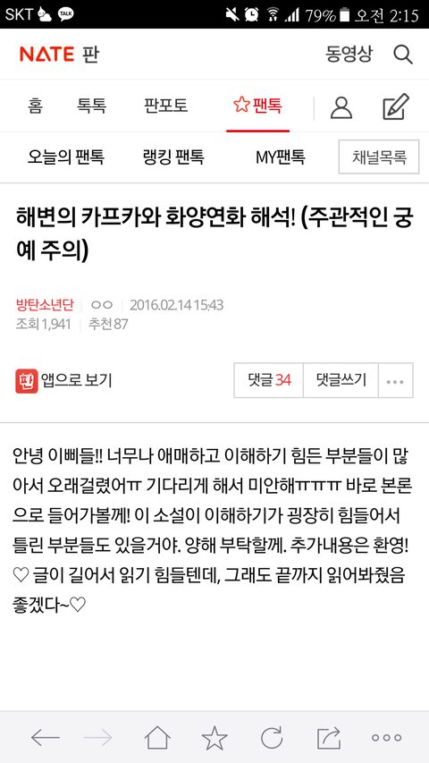 티저들 속의 여자들이 멤버들의 어머니라는 궁예가 뭔가 맞는 것 같기도 해 .. 해변의 카프카의 주인공인 '카프카'도 50대의 중년여성인 '그녀'를 사랑했거든 . 참고로 '그녀'는 현실적으로 있을 수 없는 존재이기도 해 . (어머니의 젊은 시절에 방탄이들이 같이 있을 수 없으니까 나는 이렇게 생각했어)