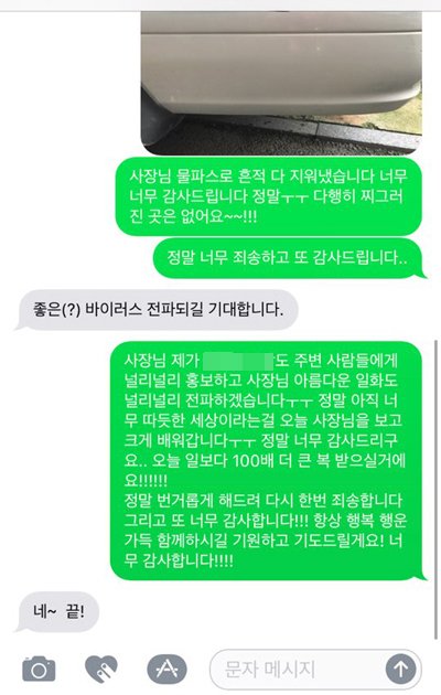 나: 전화 안되셔서 메세지 드립니다. (사진전송) 어쩌저쩌~~ 보험처리 바로 해드리겠습니다. 바쁘신데 너무너무 죄송합니다..ㅠㅠ