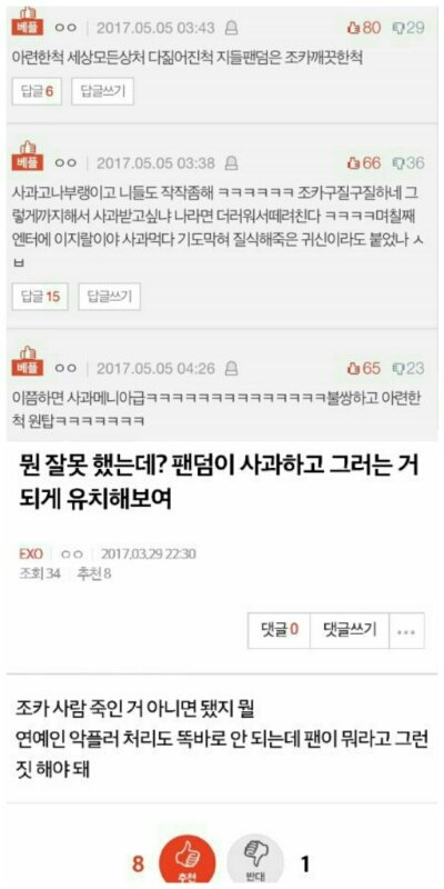 이 정도?그리고 우리 윙즈 외전 출하량으로 소속사 비꼬는 거랑 1억 기부 기사 뜨고 비꼬는 것도 있는데 이건 글이 많지 않아서 일단 자료만 풀게.