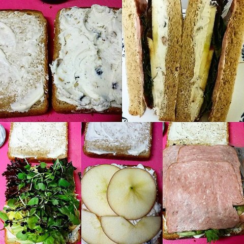 집에서 만든 리코타 치즈에 견과류 섞어서 빵에 베이스로 발라주고 야채와 사과와 햄 넣어 마무리...