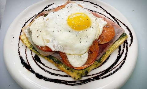 집에서 만든 바질 페스토를 토스트한 플랫 브레드에 바르고 토마토 햄 시금치 계란 프라이 얹고 그라나 파다노 갈아서 올린 든든한 아침 식사~