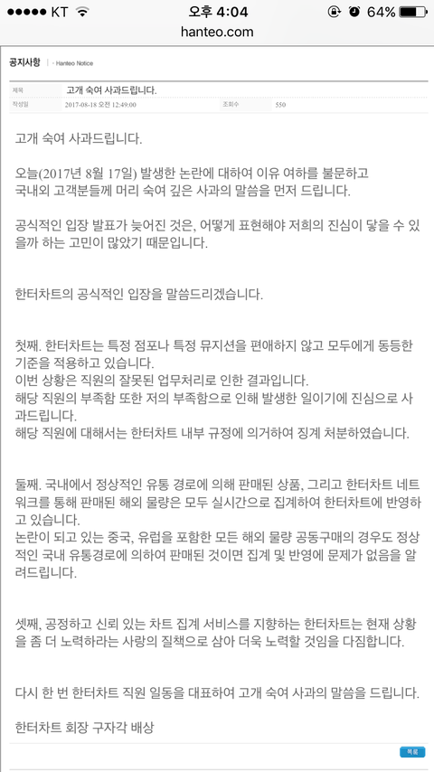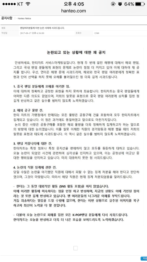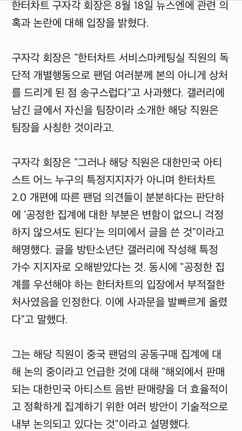 ㅎㅌ직원이라는 사람이 방탄에게 유리하게끔 되어있다는 글을 씀(루머) - 그 글이 난리가 남 - 온갖 욕, 머리채는 방탄이 다 잡힘 - ㅎㅌ에서 공식입장을 냄 (사건 설명과 그 직원의 징계결과 그리고 해명, 어느 팬덤에게 유리하지 않다) ------ 근데 정작 아무잘못없는 우리애들은 그 글이 올라옴과 동시에 온갖 욕과 함께 머리채 잡힘