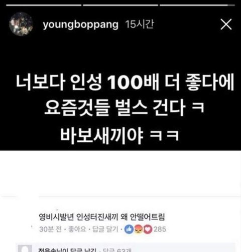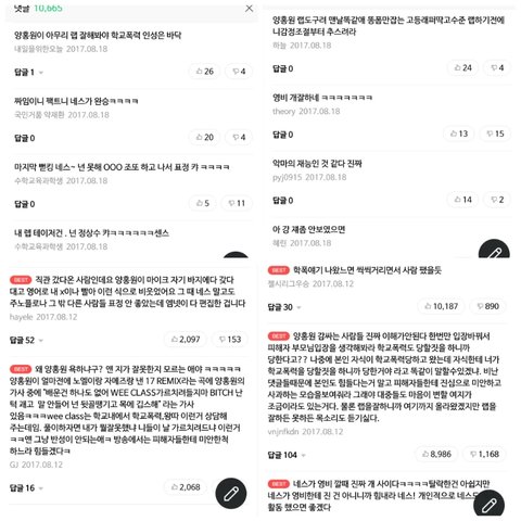 너희도 악플다는거 째한태는 학폭아니냐 그리고 니들은 애들뒷담도안하고 친구들한태 욕도안하나봐 양홍원같은애들이 욕하면 니들은 개처럼달려들고 니들이욕하면 다 장난이고 넘어가야되겟네 양홍원 저리 가해자여가지고 피해자 느낌좀 알아봐라 하면서하는데 댓글로욕하고 그러는거 째한탠 또 가해자임 쩌기서 댓글로 욕하는애들은 다욕먹어야됨 그럼.