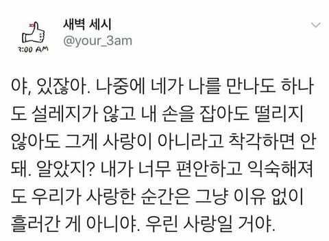 남친이랑 헤어진 한달됐는데 충분한 사랑을 못받아서 아직도 외롭다 연락하는 남자애들은 많고 새벽까지 전화하는 남자애도 있는데 외로워.. 누군가 나의 하루 일과를 물어봐줬으면 좋겠다 그럼 나 재잘재잘 참새처럼 떠들 자신 있는데.. 힘들땐 나를 꼭 안아주면서 괜찮냐고 해주면 좋겠다 외롭다
