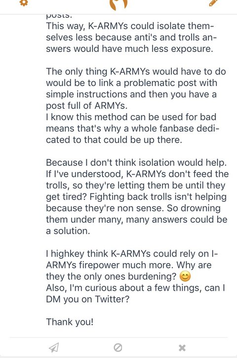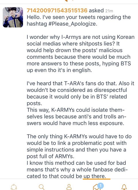 "만약에 한국아미들이 방탄에 대한 안좋은 글을 본다면 우리 해외아미들에게 링크를 주는게 어때? 우리가 받은 링크에만 들어가서 다른 곳에서 무례한 행동을 하지 않을거야. ㅌㅇㄹ 팬들도 이 방법을 쓴다고 들었어.