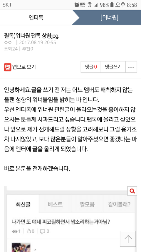 ㅇㅌ정화때문에 팬톡에 잘 안들어왔었는데 진짜 갤련들 왔었어?