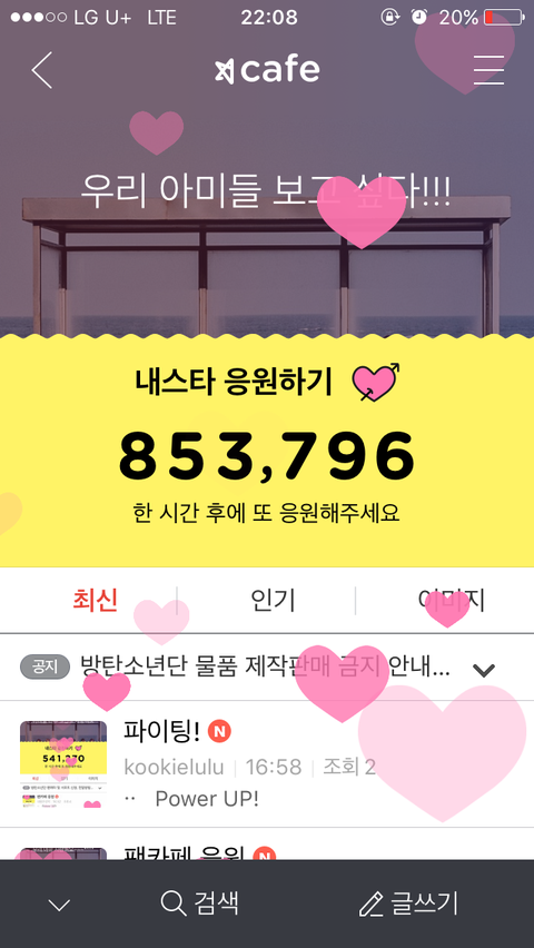 응원하기 한번 누르고 5초 또 뉴르고 5초 한시간에 이거 하는데 50초 밖에 안걸림 안어렵지? 오늘 1위 못하면 남은 기간 1위해봤자 말짱도로묵이래 필요없대 소잃고 외양간고치는거래 제발 다 하고오자!!