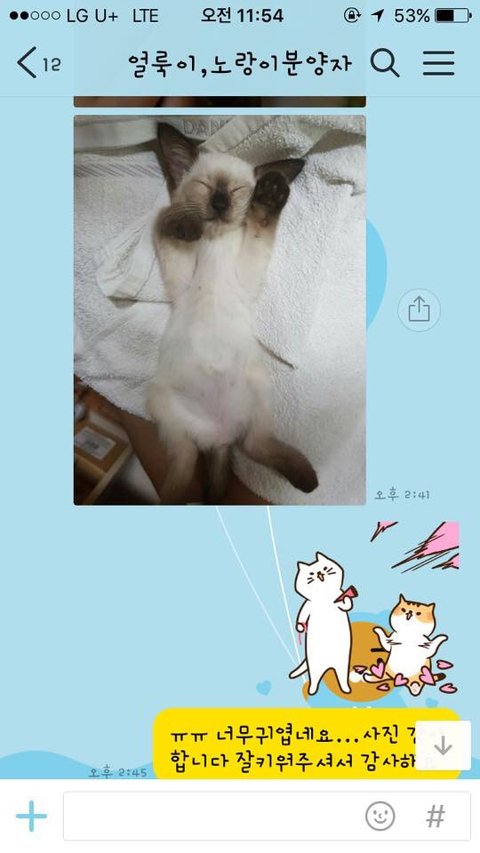 특히나 제가 아끼는 얼룩이를 분양해가서 먼저 톡을했고 잘지내고 있다고 사진까지 보내줬네요...자기집인마냥, 그리고 나머지 한마리는 우리고양이인 마냥..
